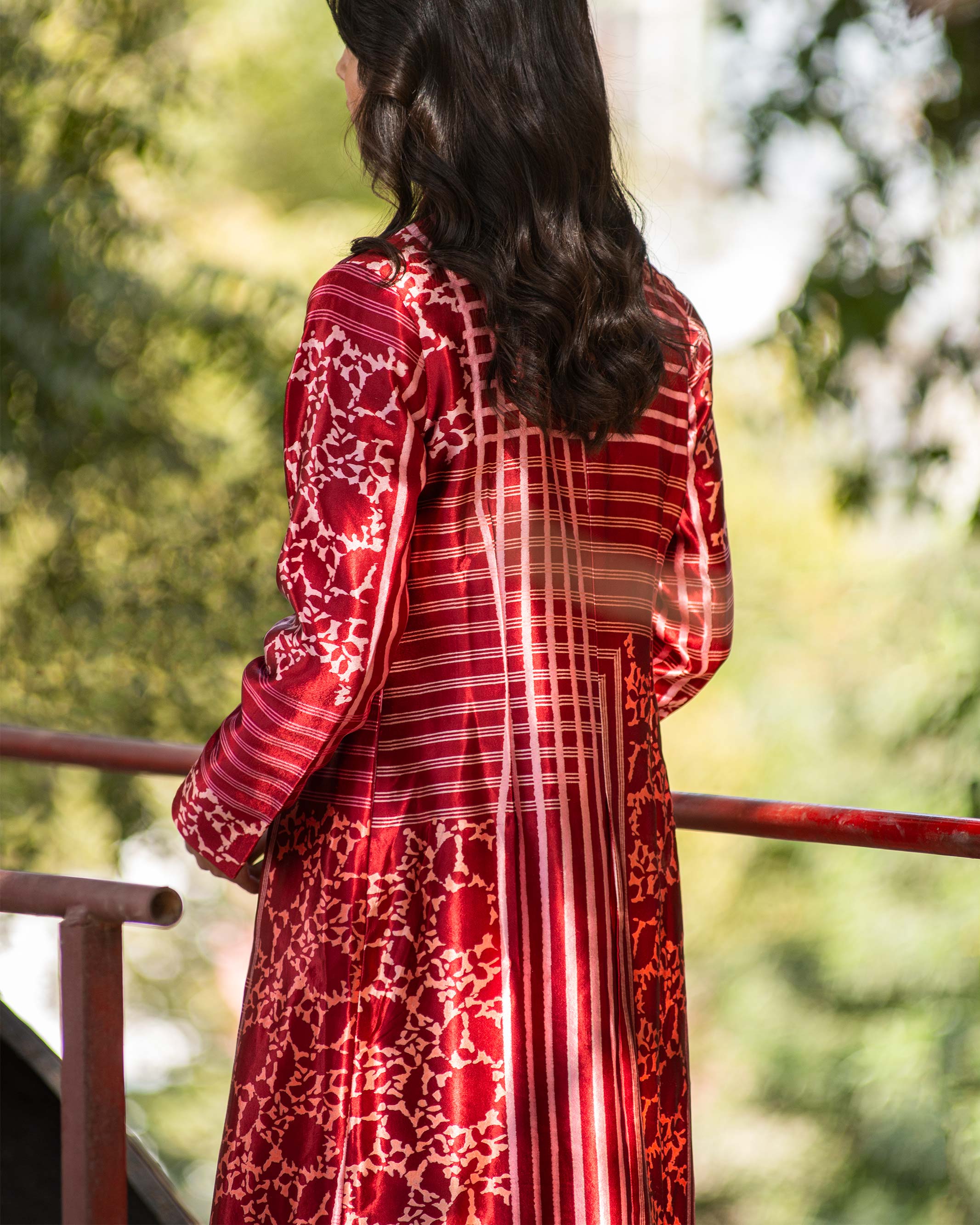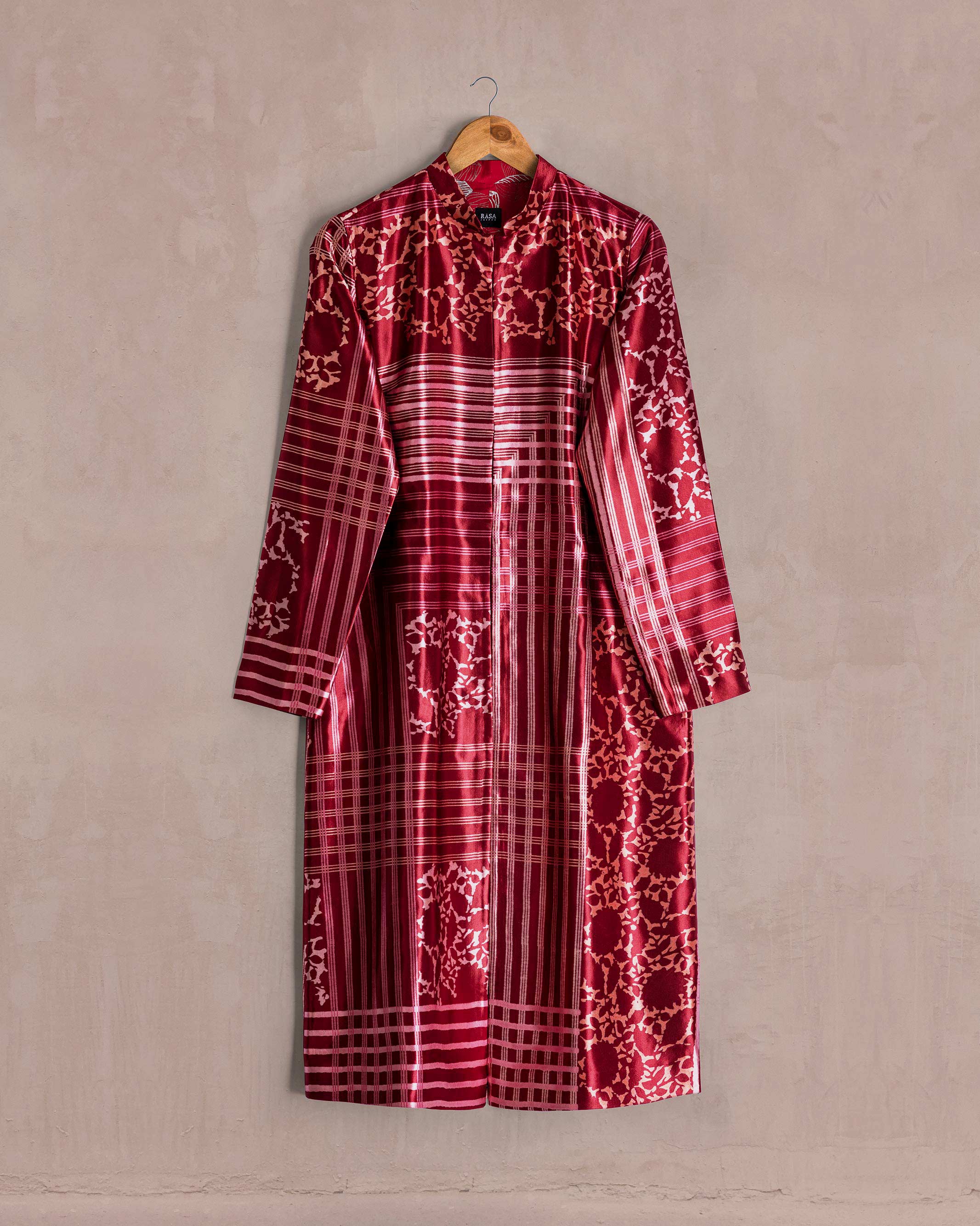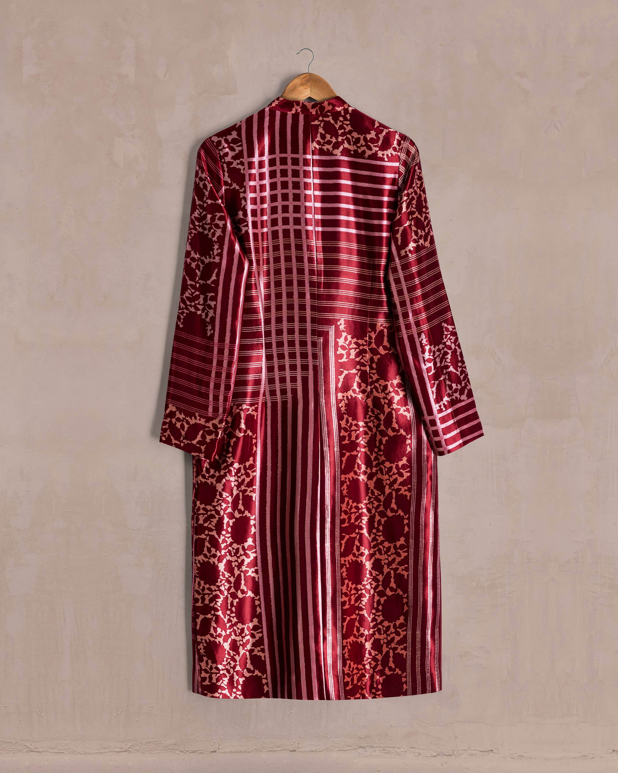 Red Pink Krishna & Stripes Long Mushru Jacket