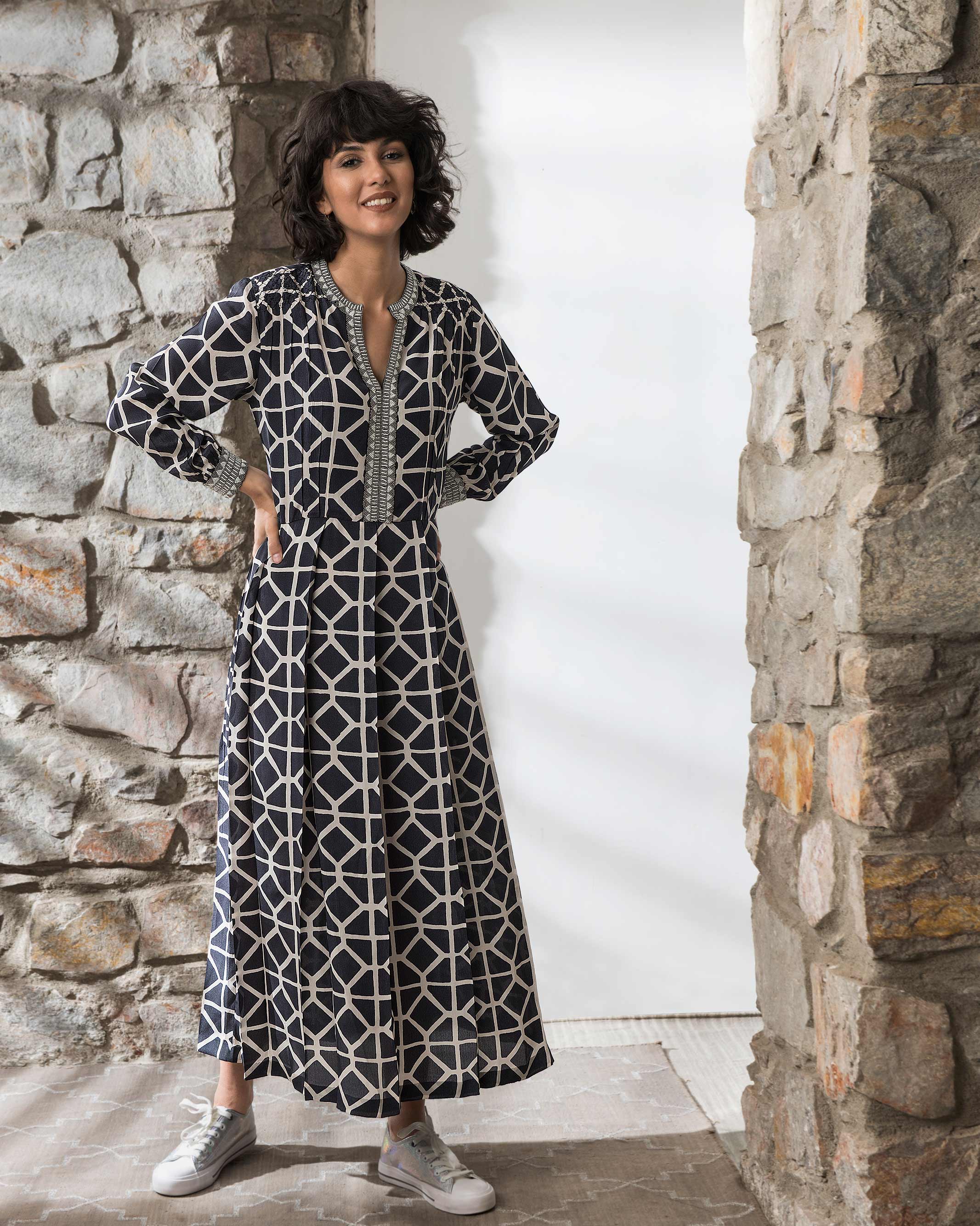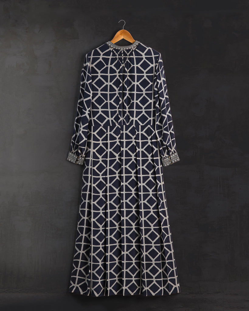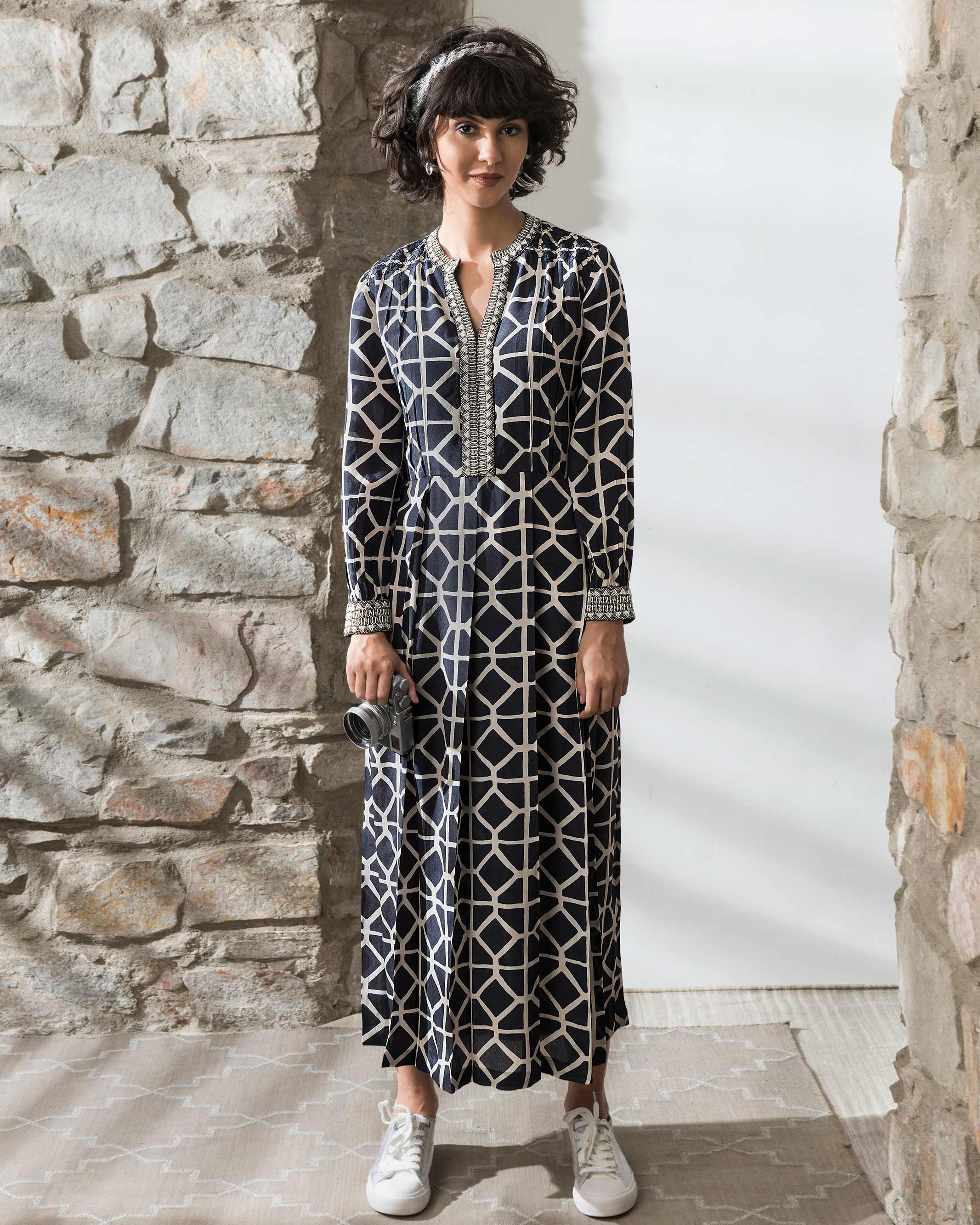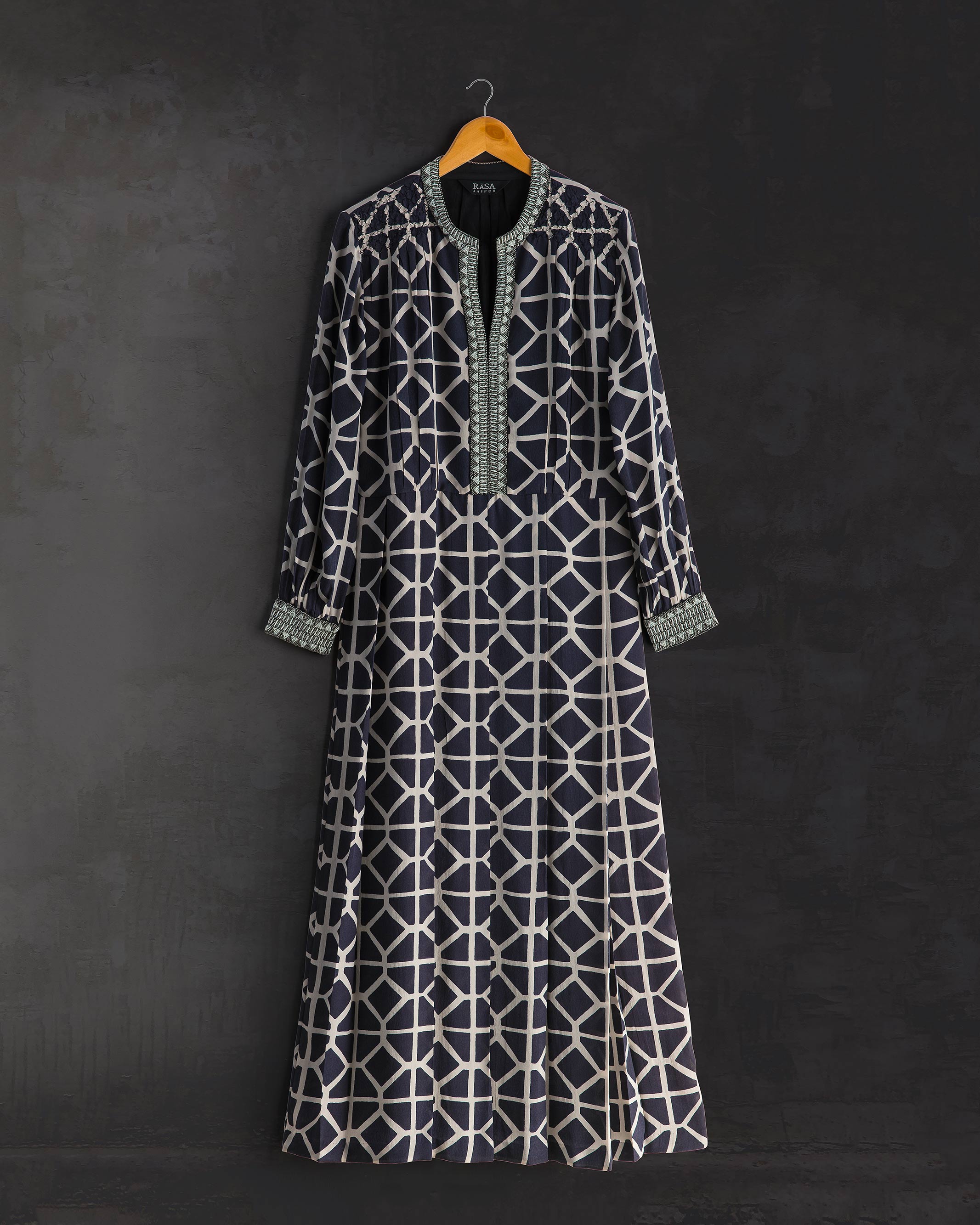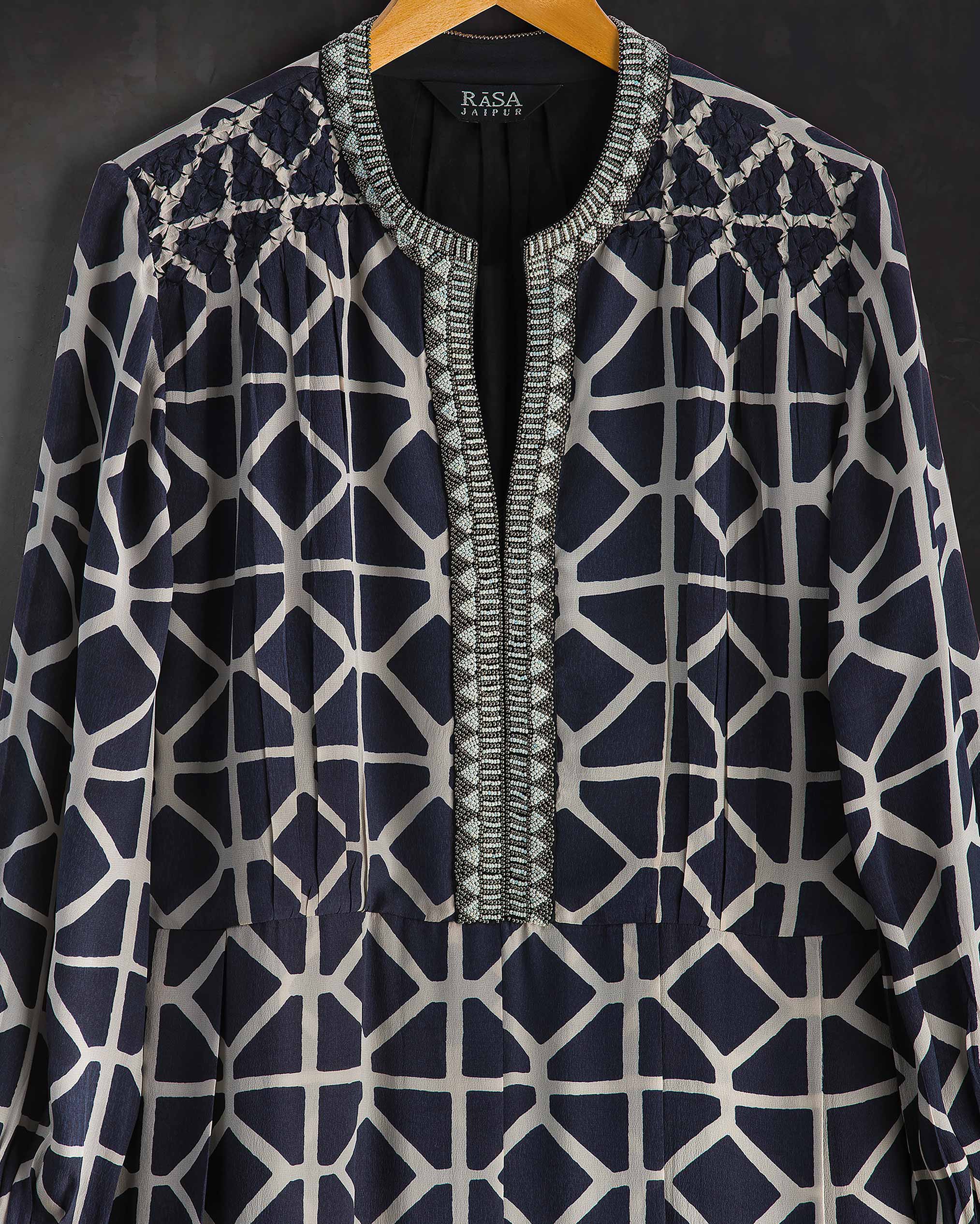 Hand block printed on black silk; one of our favourites. A compelling length with delicate beaded embroidery on the cuffs and the neck line running all the way down to the waist |