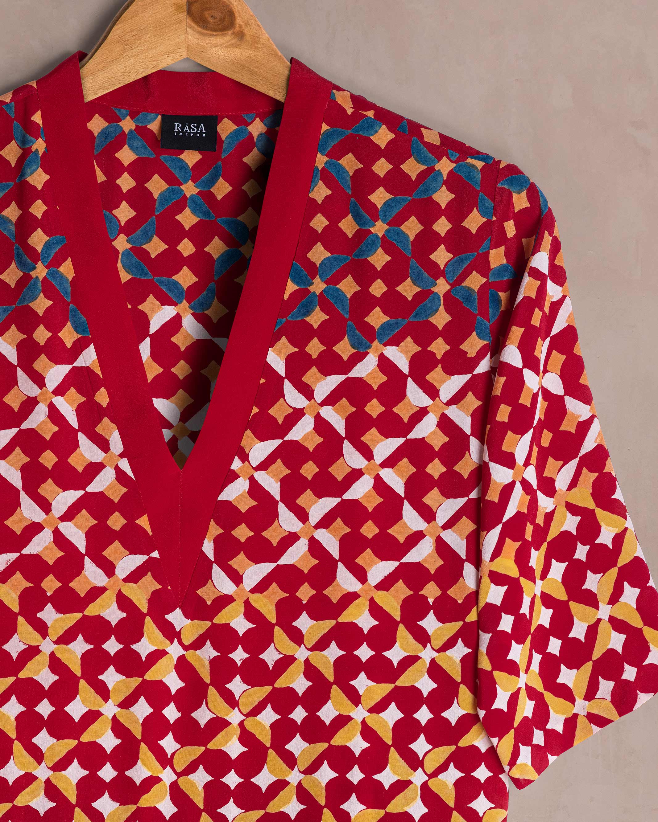 | Description | Hand block printed Firki (playful pinwheel) in shades of red fuchsia purple in pure silk crepe. A flowing maxi dress seamed at the waist with box pleats running to the bottom with a V neck band |